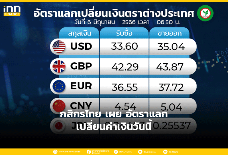 อัตราแลกเปลี่ยนเงินตราต่างประเทศ ของธนาคารกสิกรไทย เวลา 06.50 น. ดอลลาร์สหรัฐ รับซื้อ 33.60 บาท ขายออก 35.04 บาท