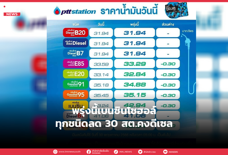 ปตท. บางจาก ลดราคาขายปลีกน้ำมันกลุ่มเบนซินและแก๊สโซฮอล์ทุกชนิด 30 ส.ต./ลิตร ส่วนกลุ่มดีเซลคงเดิม มีผล 30 พ.ค.