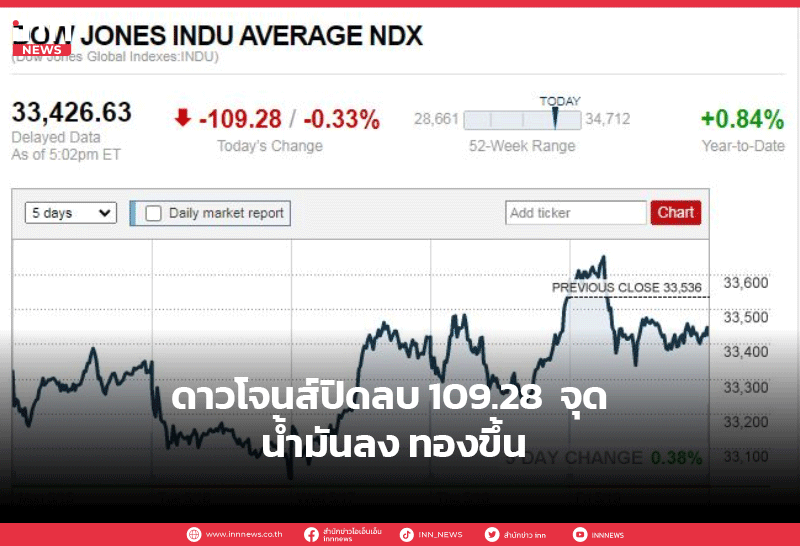 ดาวโจนส์ปิดลบ 109.28 จุด น้ำมันลง ทองขึ้น