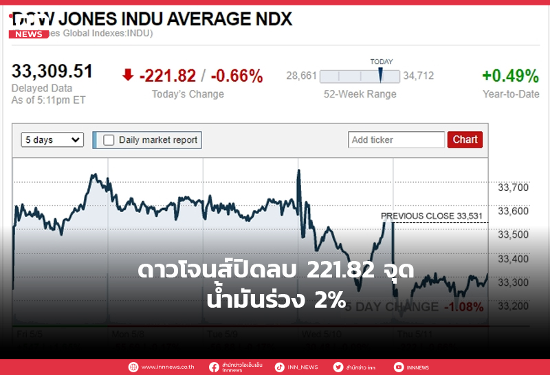 ดาวโจนส์ปิดลบ 221.82 จุด น้ำมันร่วง 2%