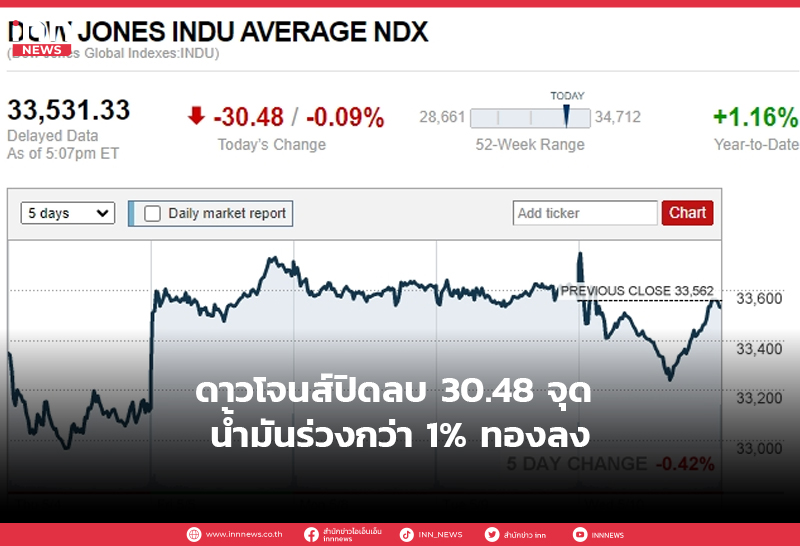 ดาวโจนส์ปิดลบ 30.48 จุด น้ำมันร่วงกว่า 1% ทองลง