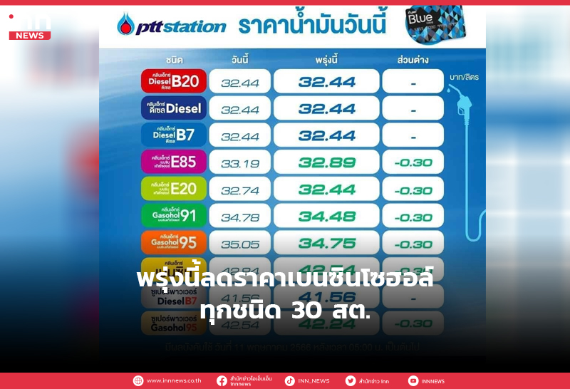 พรุ่งนี้ลดราคาเบนซินโซฮอล์ทุกชนิด 30 สต.