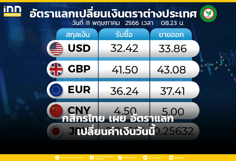 อัตราแลกเปลี่ยนเงินตราต่างประเทศ ของธนาคารกสิกรไทย เวลา 08.23 น. ดอลลาร์สหรัฐ รับซื้อ 32.48 บาท ขายออก 33.92 บาท