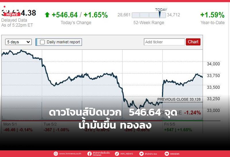 ดาวโจนส์ปิดบวก 546.64 จุด น้ำมันขึ้น ทองลง