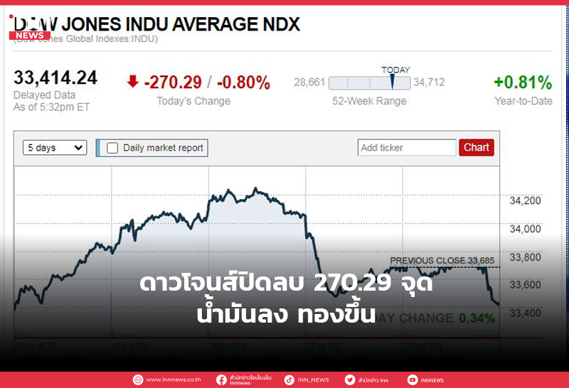 ดาวโจนส์ปิดลบ 270.29 จุด น้ำมันลง ทองขึ้น