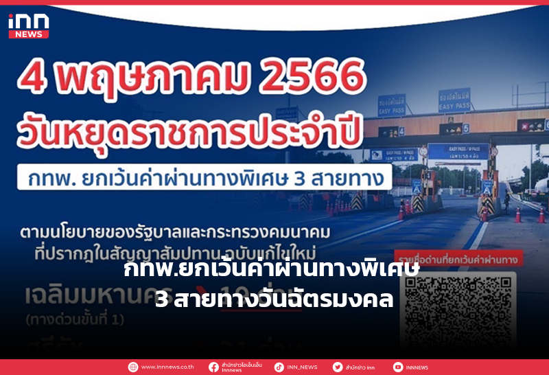 การทางพิเศษแห่งประเทศไทย ยกเว้นการเก็บค่าผ่านทางพิเศษ 3 สายทาง ในวันฉัตรมงคล 4 พฤษภาคม 2566