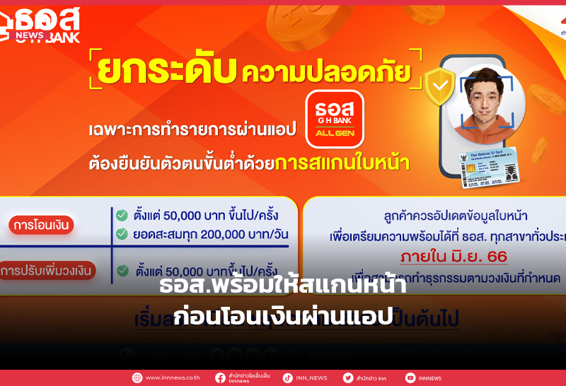 ธอส. พร้อมให้ยืนยันตัวตนด้วยใบหน้าก่อนโอนเงินผ่าน Application : GHB ALL GEN