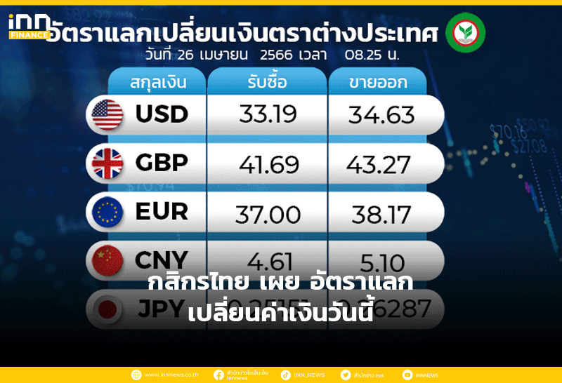 อัตราแลกเปลี่ยนเงินตราต่างประเทศ ของธนาคารกสิกรไทย เวลา 08.25 น. ดอลลาร์สหรัฐ รับซื้อ 33.19 บาท ขายออก 34.63 บาท