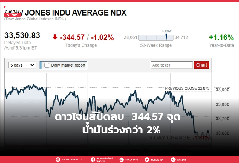 ดาวโจนส์ปิดลบ 344.57 จุด น้ำมันร่วงกว่า 2%