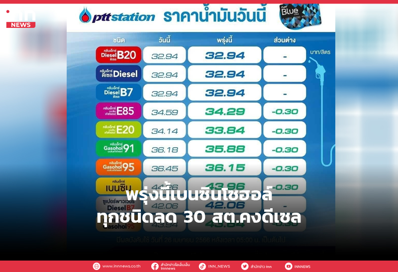 ปตท. บางจาก ลดราคาขายปลีกน้ำมันกลุ่มเบนซินและแก๊สโซฮอล์ทุกชนิด 30 ส.ต./ลิตร ส่วนกลุ่มดีเซลคงเดิม มีผล 26 เม.ย.