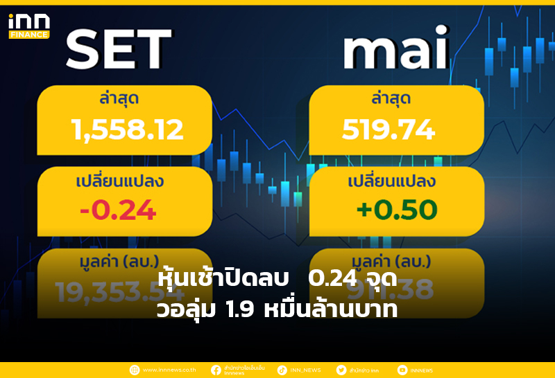 ตลาดหุ้นเช้าปิดลบ 0.24 จุด แตะ 1,558.12 จุด มูลค่าการซื้อขาย 19,353.54 ล้านบาท ลดลง 707 หลักทรัพย์