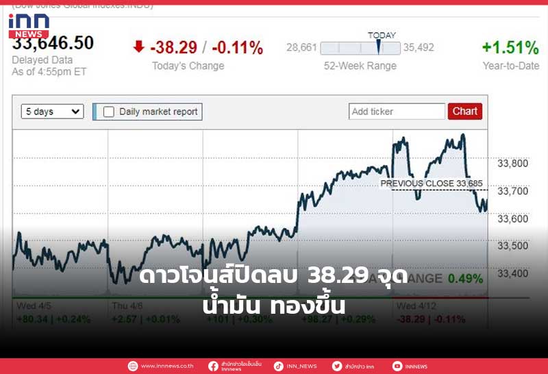 ดาวโจนส์ปิดลบ 38.29 จุด น้ำมัน ทองขึ้น