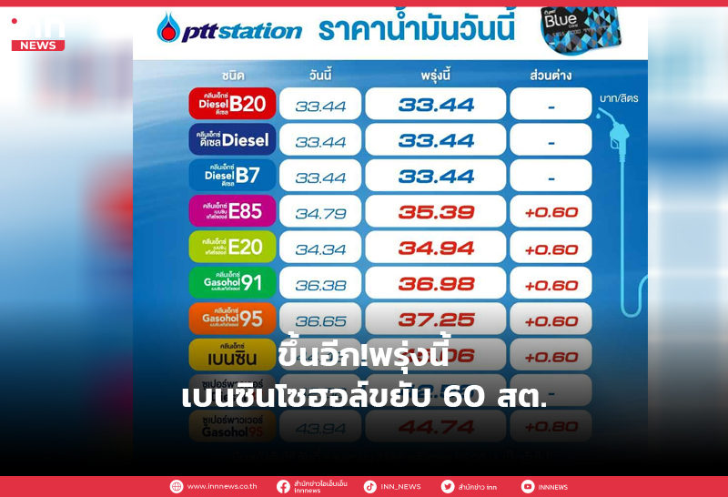 ขึ้นอีก!พรุ่งนี้เบนซินโซฮอล์ขยับ 60 สต.