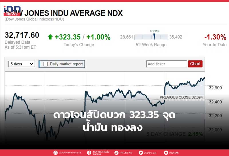 ดาวโจนส์ปิดบวก 323.35 จุด น้ำมัน ทองลง