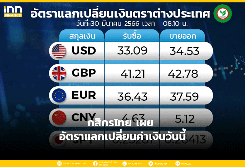 อัตราแลกเปลี่ยนเงินตราต่างประเทศ ของธนาคารกสิกรไทย เวลา 08.10น. ดอลลาร์สหรัฐ รับซื้อ 33.09 บาท ขายออก 34.53 บาท