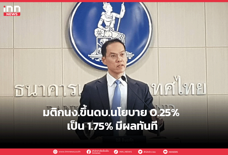 มติกนง.ขึ้นดบ.นโยบาย 0.25% เป็น 1.75% มีผลทันที