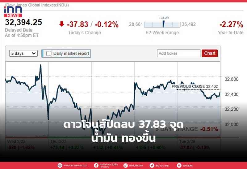 ดาวโจนส์ปิดลบ 37.83 จุด น้ำมัน ทองขึ้น