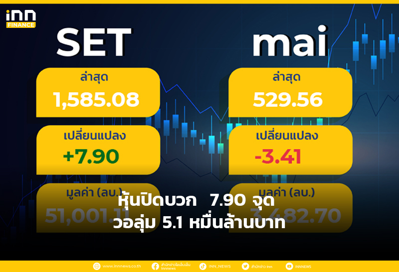 ตลาดหุ้นไทยปิดบวก 7.90 จุด แตะ 1,585.08 จุด มูลค่าการซื้อขาย 51,001.11 ล้านบาท เพิ่มขึ้น 683 หลักทรัพย์