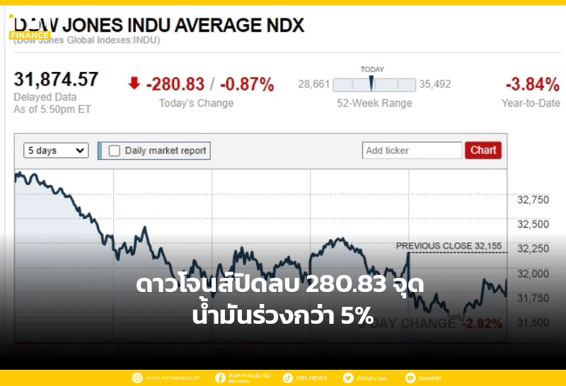 ดาวโจนส์ปิดลบ 280.83 จุด น้ำมันร่วงกว่า 5%