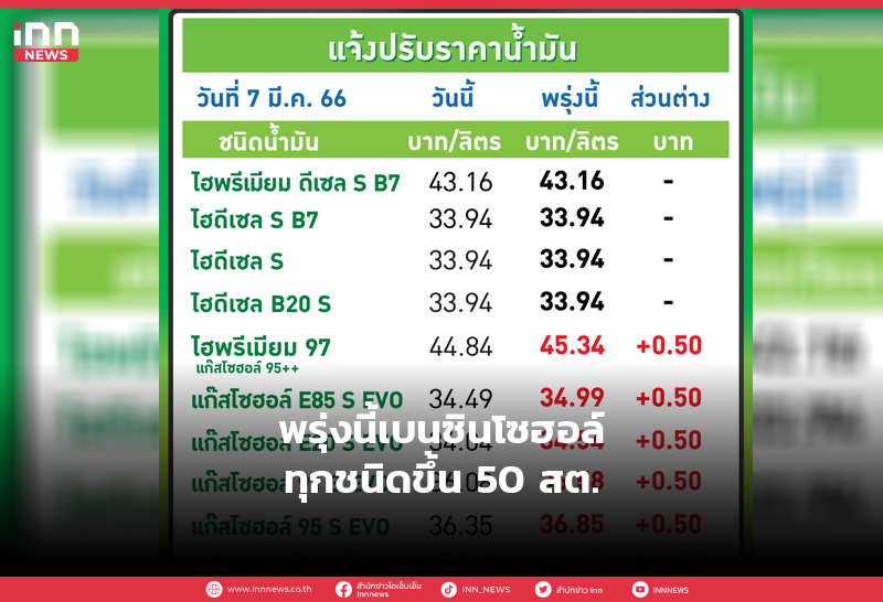พรุ่งนี้เบนซินโซฮอล์ทุกชนิดขึ้น 50 สต.