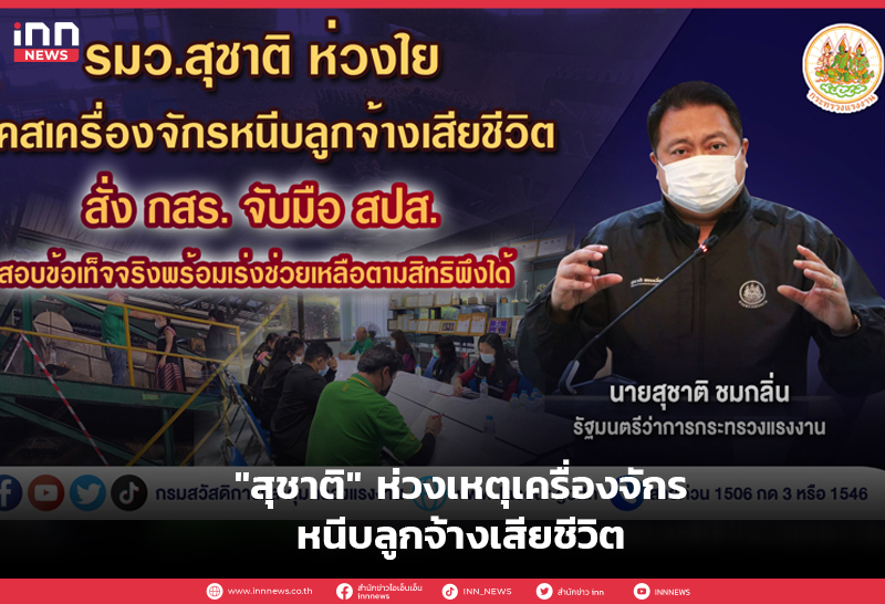 รมว.สุชาติ ห่วงใย กรณีเครื่องจักรหนีบลูกจ้างเสียชีวิต สั่ง กสร.จับมือ สปส.สอบข้อเท็จจริงพร้อมเร่งช่วยเหลือตามสิทธิพึงได้