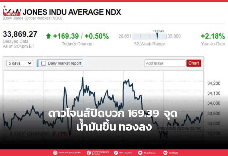 ดาวโจนส์ปิดบวก 169.39 จุด น้ำมันขึ้น ทองลง