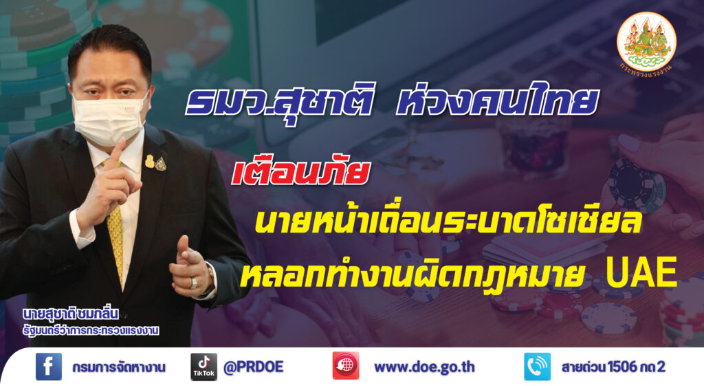กระทรวงแรงงาน เตือนนายหน้าเถื่อนระบาดโซเชียล หลอกคนไทยใช้วีซ่าท่องเที่ยว เดินทางเข้า UAE ทำงานพนันออนไลน์ และ นวดแฝง