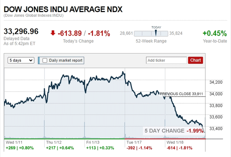 ดาวโจนส์ปิดร่วง 613.89 จุด น้ำมัน ทองลง