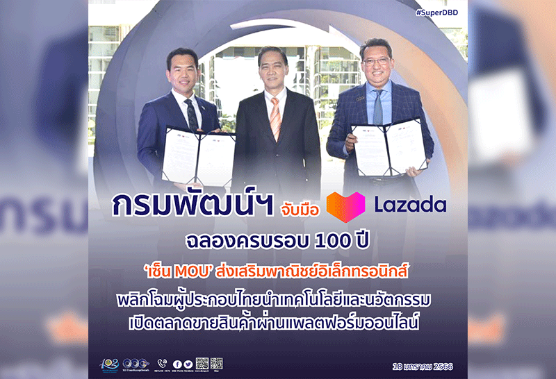 กรมพัฒนาธุรกิจการค้า ฉลองครบรอบ 100ปี จับมือลาซาด้า ‘เซ็น MOU’ ส่งเสริมพาณิชย์อิเล็กทรอนิกส์ พลิกโฉมผู้ประกอบไทยนำเทคโนโลยีและนวัตกรรม เปิดตลาดขายสินค้าผ่านแพลตฟอร์มออนไลน์