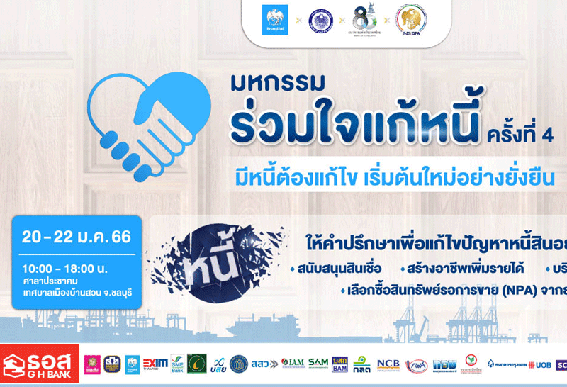 กรุงไทยยกทัพมาตรการช่วยลูกค้าภาคตะวันออกแก้หนี้อย่างยั่งยืน ในงาน “มหกรรมร่วมใจ แก้หนี้สัญจร: มีหนี้ต้องแก้ไข เริ่มต้นใหม่อย่างยั่งยืน” จ.ชลบุรี ครั้งที่ 4 วันที่ 20-22 ม.ค. 2566