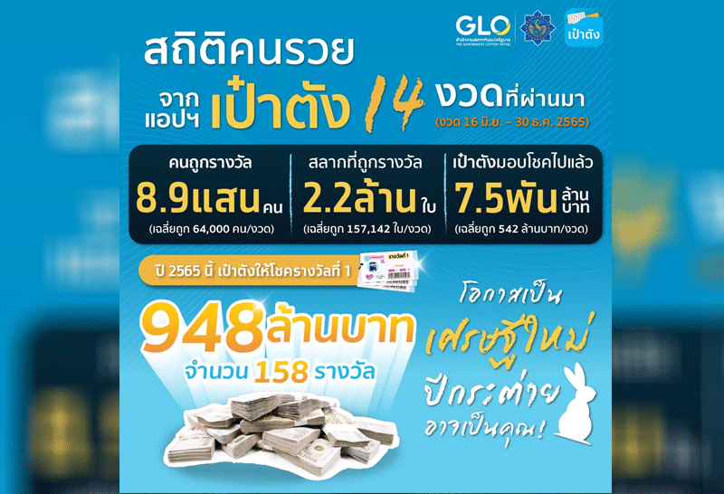 เปิดสถิติ "สลากดิจิทัล" บนแอปพลิเคชัน “เป๋าตัง” ปี 65 มอบโชคคนดวงเฮง 8.9 แสนคน วงเงิน 7,500 ล้านบาท