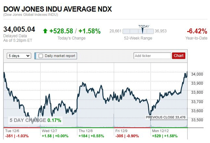 ดาวโจนส์ปิดบวก 528.58 จุด น้ำมันขึ้น ทองลง