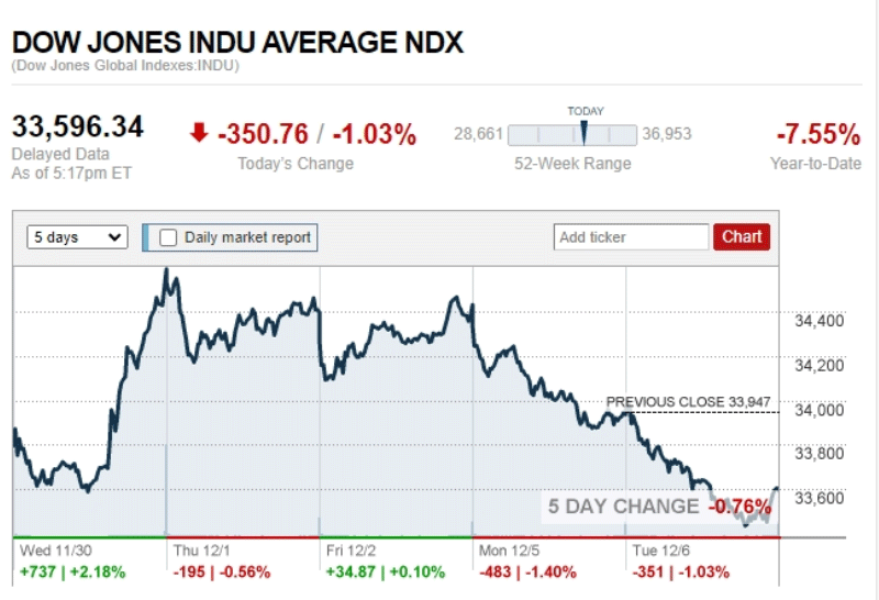 ดาวโจนส์ปิดลบ 350.76 จุด น้ำมัน WTI ร่วง 3.5%