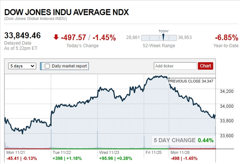 ดาวโจนส์ปิดร่วง 497.57 จุด น้ำมันขึ้น ทองลง