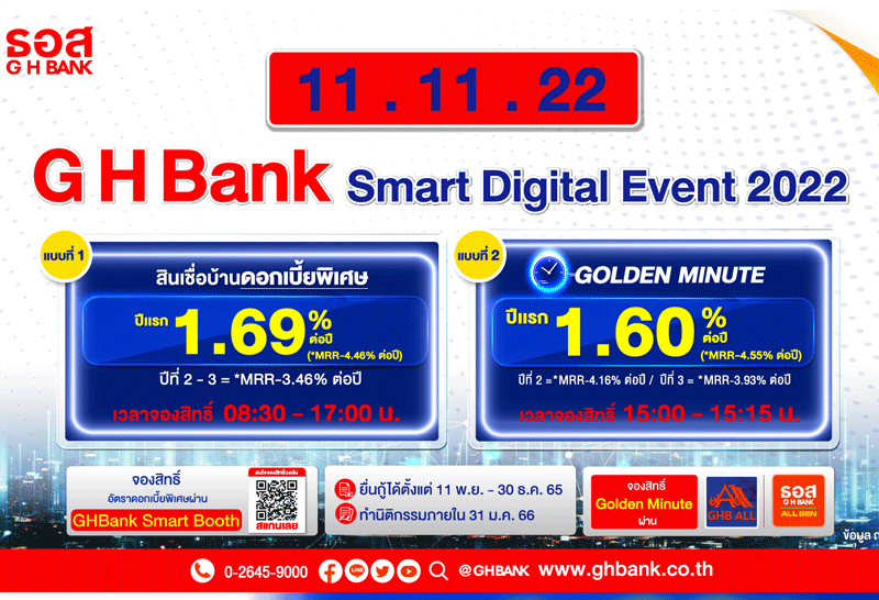 ธนาคารอาคารสงเคราะห์ จัดงาน GHBank Smart Digital Event 2022 วันที่ 11 เดือน 11 พบสินเชื่ออัตราดอกเบี้ยพิเศษช่วง Golden Minute ปีแรกเพียง 1.60% ต่อปี เท่านั้น