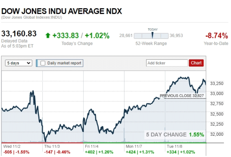ดาวโจนส์ปิดบวก 333.83 จุดน้ำมันร่วง ทองขึ้น