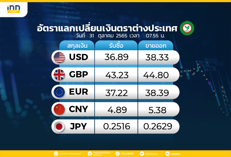 อัตราแลกเปลี่ยนเงินตราต่างประเทศ ของธนาคารกสิกรไทย เวลา 07.55 น. ดอลลาร์สหรัฐ รับซื้อ 36.89 บาท ขายออก 38.33 บาท