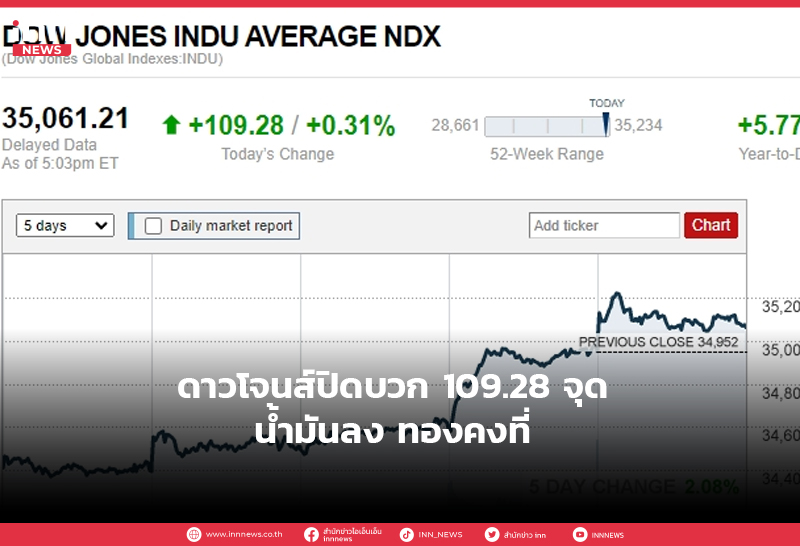 ดาวโจนส์ปิดบวก 109.28 จุด น้ำมันลง ทองคงที่