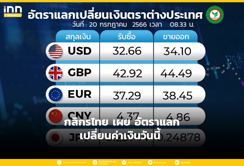 อัตราแลกเปลี่ยนเงินตราต่างประเทศ ของธนาคารกสิกรไทย เวลา 08.33น. ดอลลาร์สหรัฐ รับซื้อ 32.66 บาท ขายออก 34.10 บาท