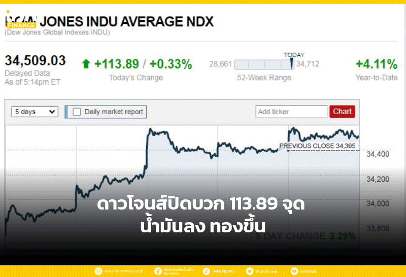 ดาวโจนส์ปิดบวก 113.89 จุด น้ำมันลง ทองขึ้น