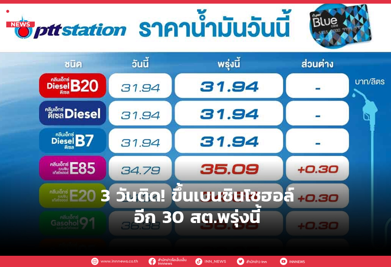 3 วันติด! ขึ้นเบนซินโซฮอล์อีก 30 สต.พรุ่งนี้
