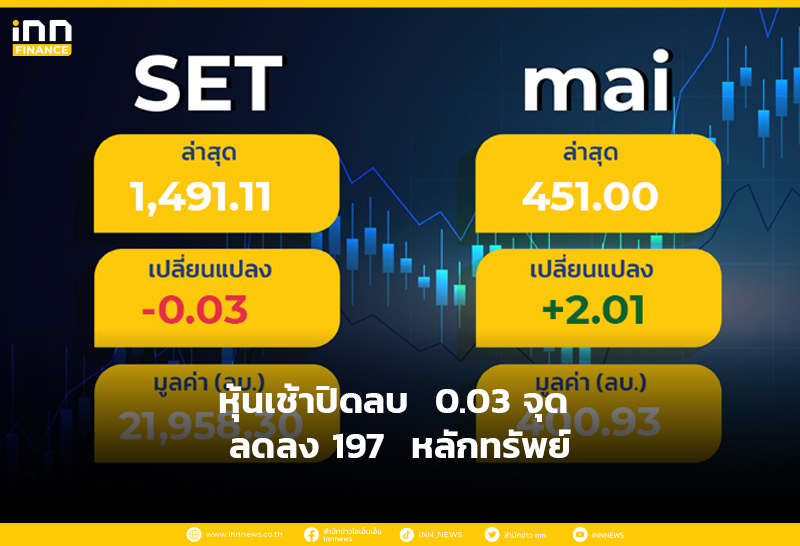 หุ้นเช้าปิดลบ 0.03 จุด ลดลง 197 หลักทรัพย์