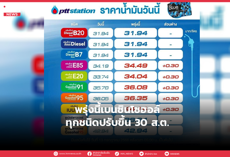 พรุ่งนี้เบนซินโซฮอล์ทุกชนิดปรับขึ้น 30 ส.ต.