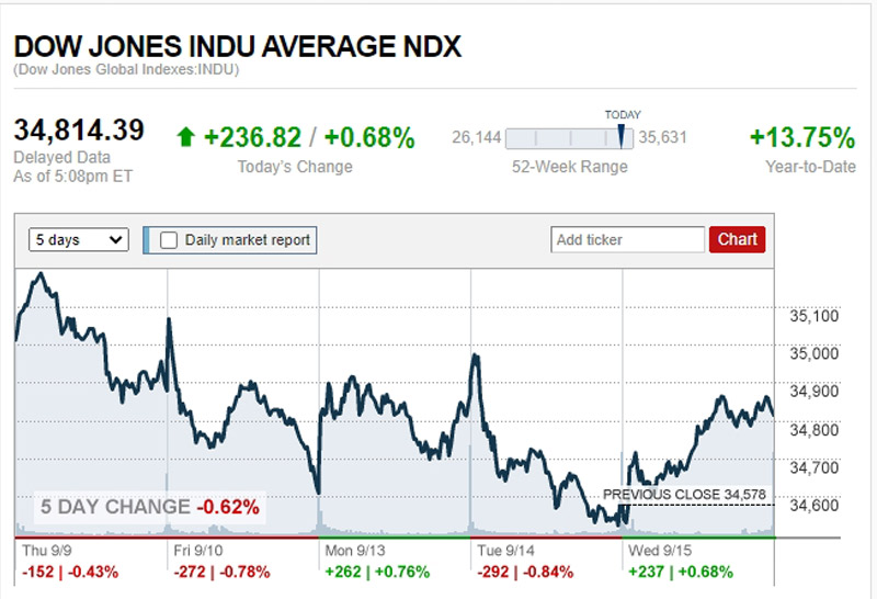 ดาวโจนส์ปิดพุ่ง 261.91 จุด ขณะน้ำมัน WTI ยืนเหนือระดับ 70 ดอลลาร์/บาร์เรล ทองปรับขึ้นแตะ 1,794.40 ดอลลาร์/ออนซ์