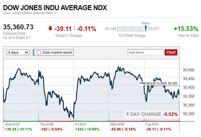 ดาวโจนส์ปิดลบ 39.11 จุด น้ำมันลง ทองขึ้น