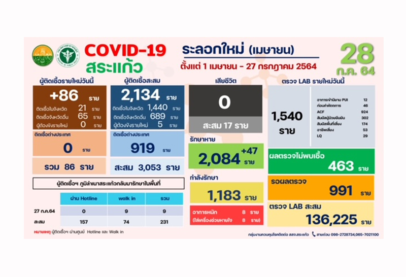 สระแก้วติดเชื้อโควิด-19เพิ่ม86ราย