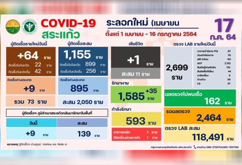จังหวัดสระแก้ว ผู้ป่วยยืนยัน 64 ราย ผู้ป่วยติดเตียงเสียชีวิตอีก 1 รายที่อรัญประเทศ