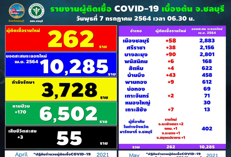 ชลบุรียังหนัก!ติดโควิดเพิ่ม262ตายอีก3ราย