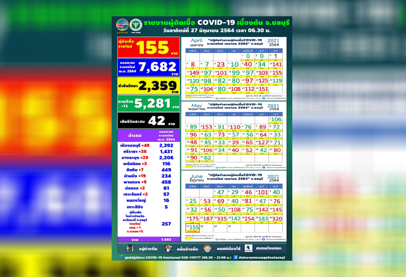 จังหวัดชลบุรีพบผู้ติดเชื้อโควิด-19 เพิ่ม 155 ค้นหาผู้สัมผัสทั้งหมด 369 ขณะค้นหาเชิงรุกเบื้องต้น 3 พันกว่าคน