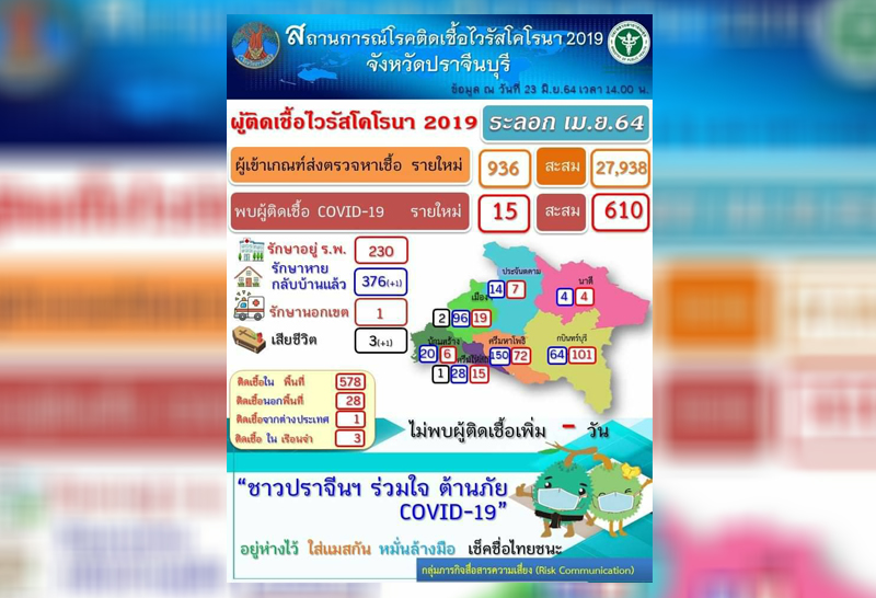 จังหวัดปราจีนบุรี โควิด-19 พบอีก 15 ราย สะสมจำนวน 610 ราย วันนี้เสียชีวิตเพิ่มอีก 1 รวม 3 ราย